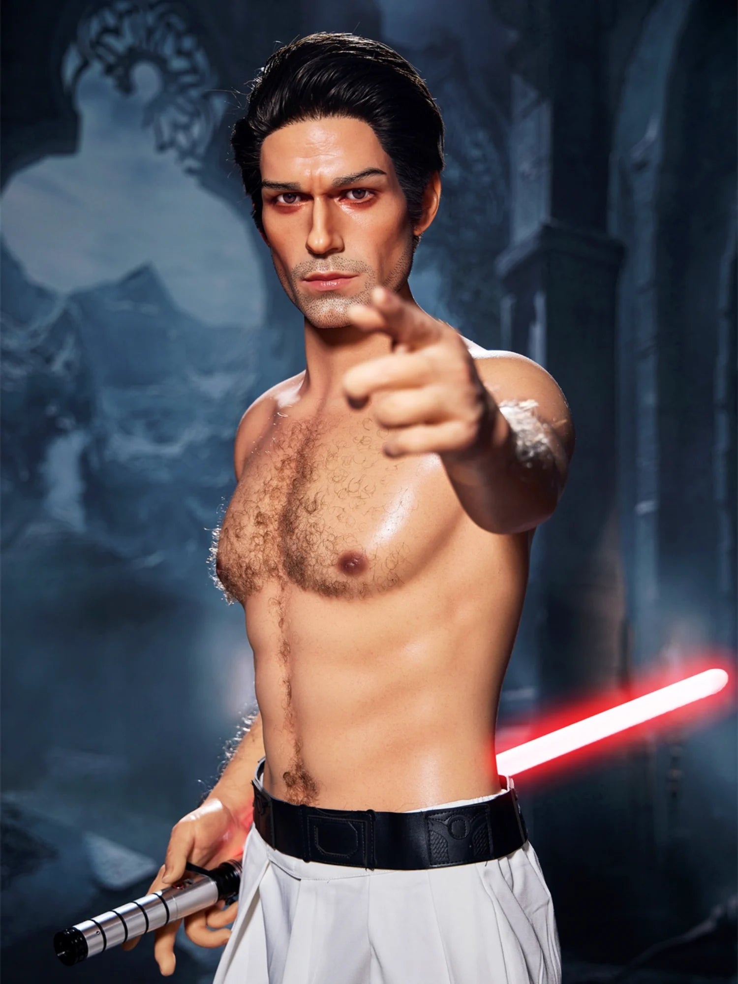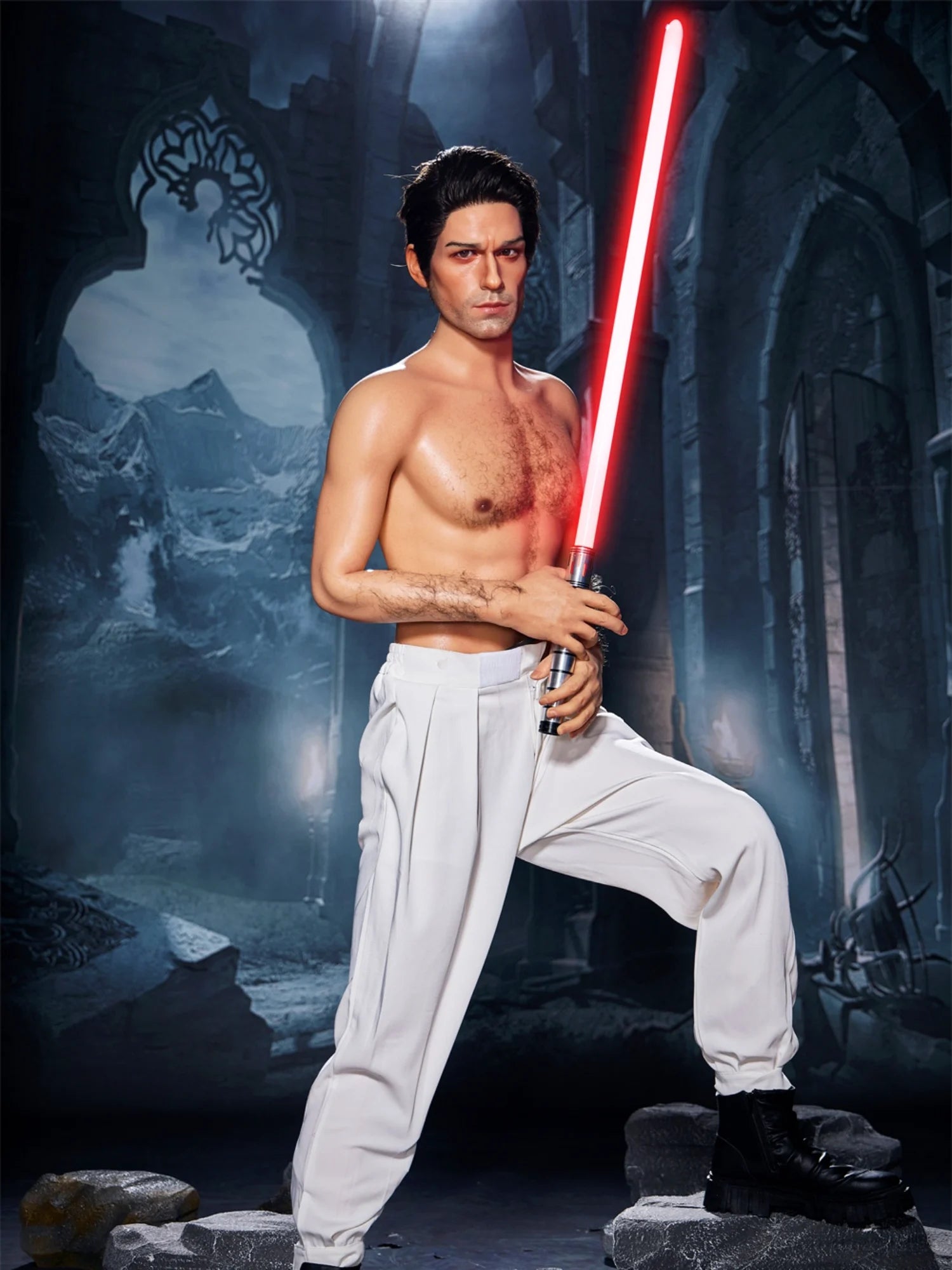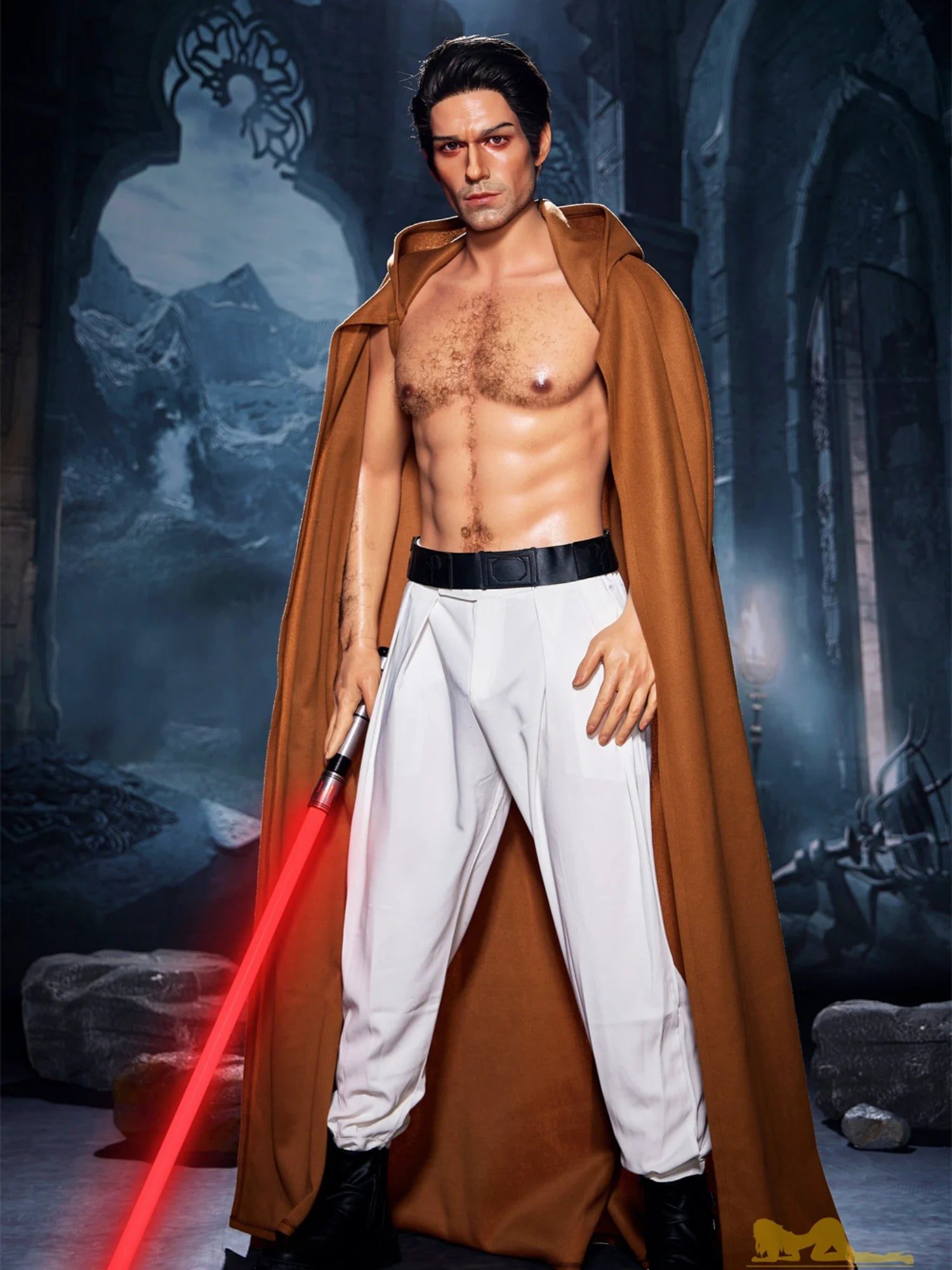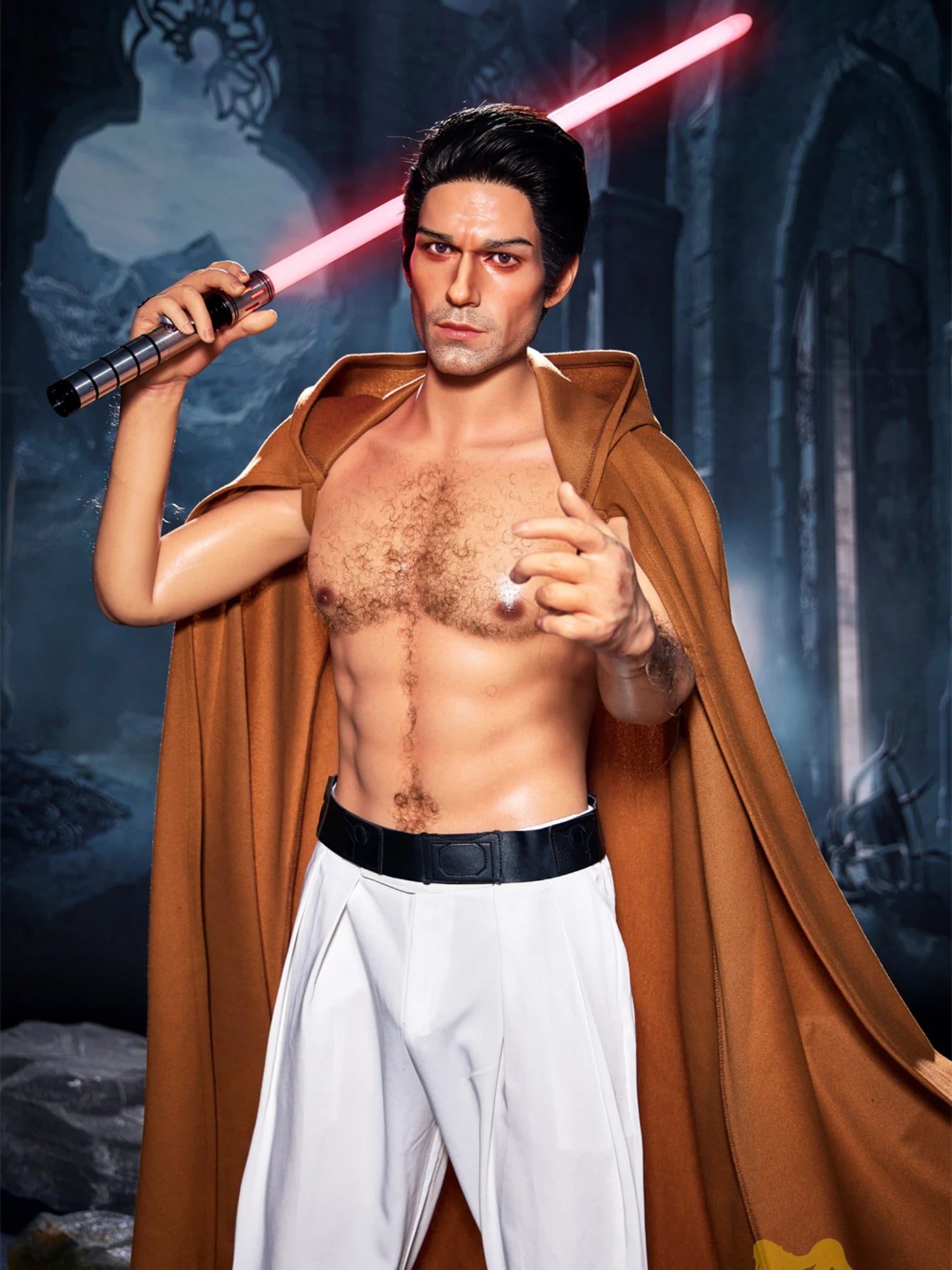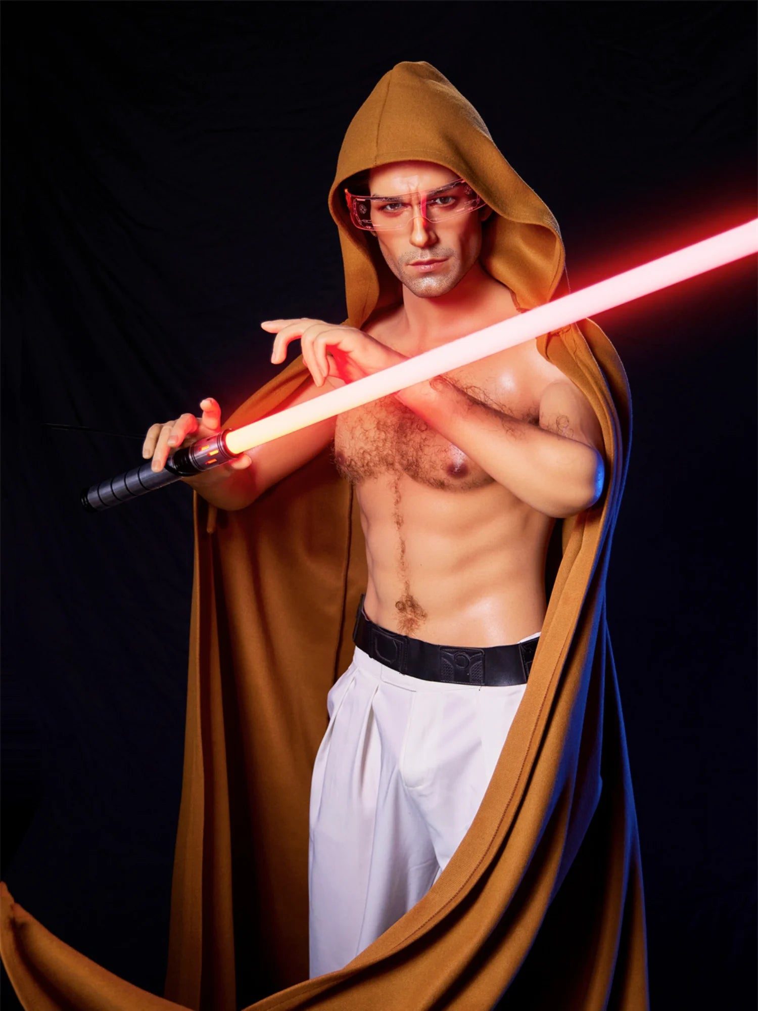 This life size male sex doll shows strong male muscle lines. and the ratio of 91cm chest circumference and 72cm waist circumference perfectly presents the beauty of masculinity. His arm muscles are distinct. as if every part contains infinite power. and with tight abdominal muscles. you can feel irresistible charm. Wearing a yellow robe and holding a Star Wars light stick. he is like a warrior walking out of the science fiction world. and every posture shows the power and sexiness of men.