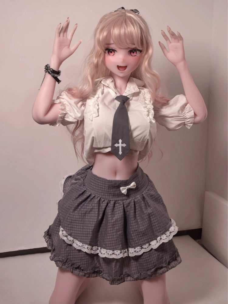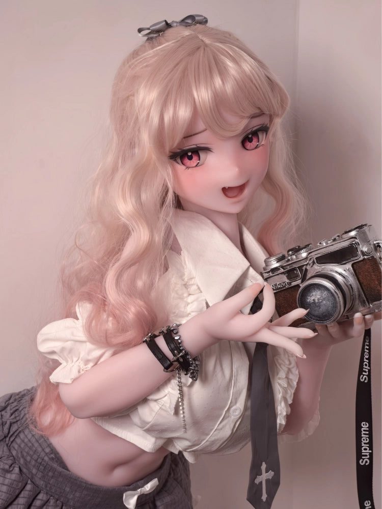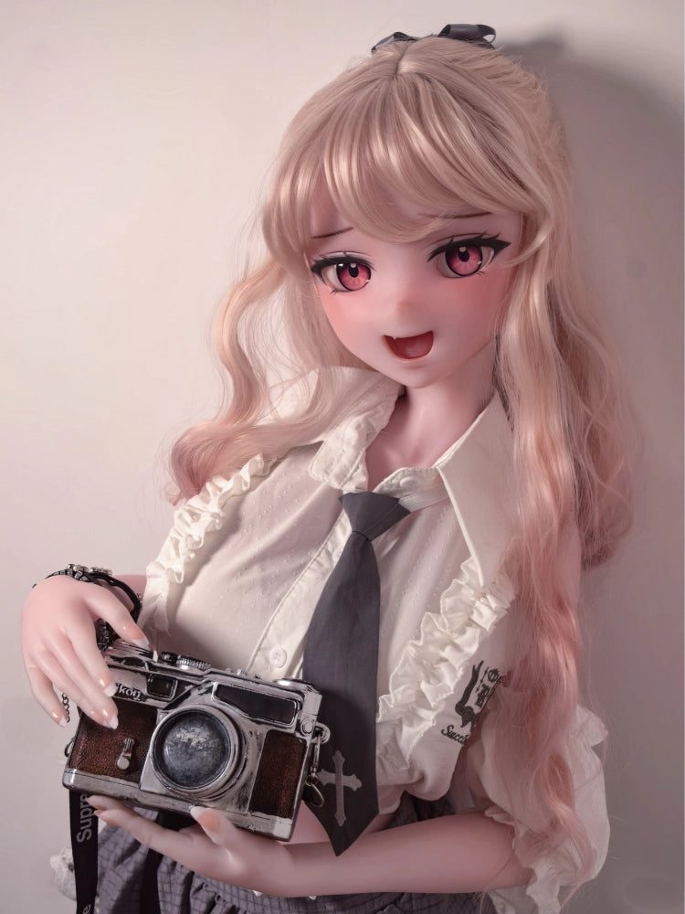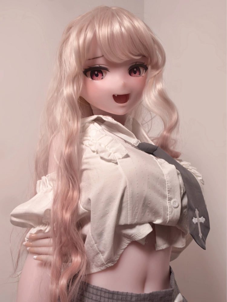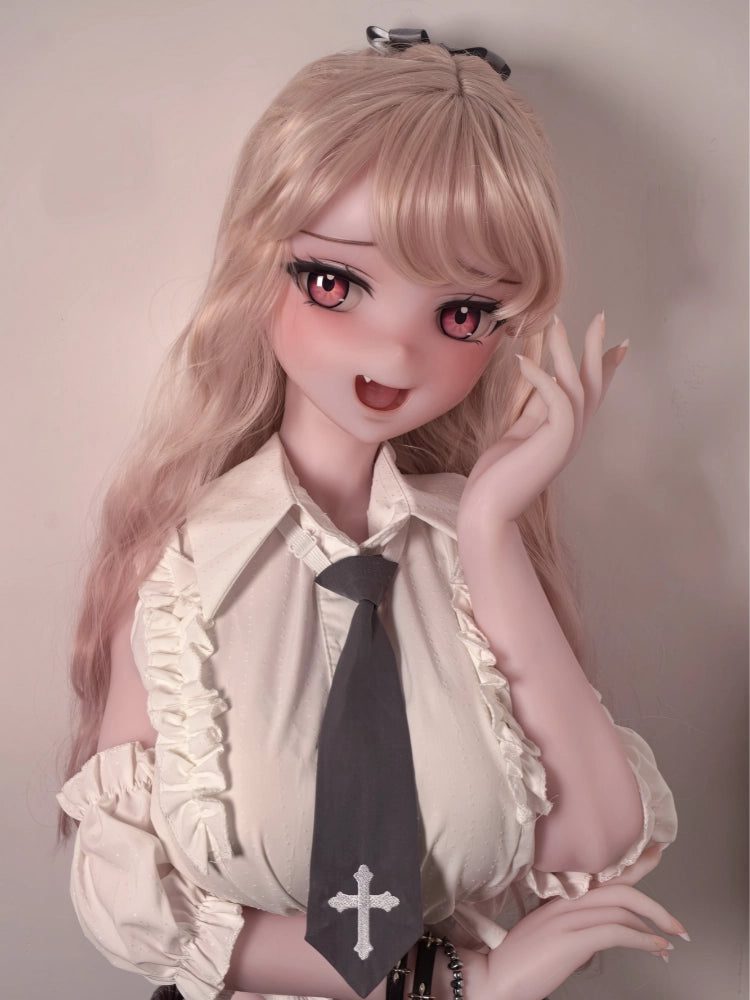 This anime style sex doll has long curly blond hair. big eyes and a small nose like a two-dimensional character. a slightly open mouth. revealing playful little tiger teeth. and pink pupils that make people excited. The whole character is sweet and lovable. as if it came out of the anime world.